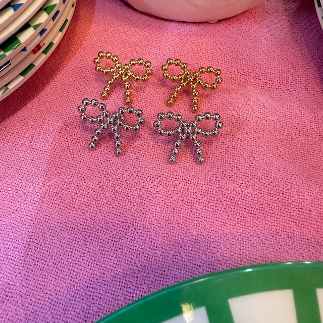 stainless ribbon tenten piercing 人気のステンレス素材のピアスに てんてんリボンデザインが可愛い ピアスが登場しました!! モチーフもほど良い大きさなのと 大人がつけてもブリブリしないナチュラルで だけどカチッと格好のつく 大人リボンピアスです! 一つあるととても便利、お色味によっては 会社につけて行っても良さそう! ステンレスなのでシャワーOKなのもうれしい! アレルギーも心配なし! ギフトにもどうぞ!
