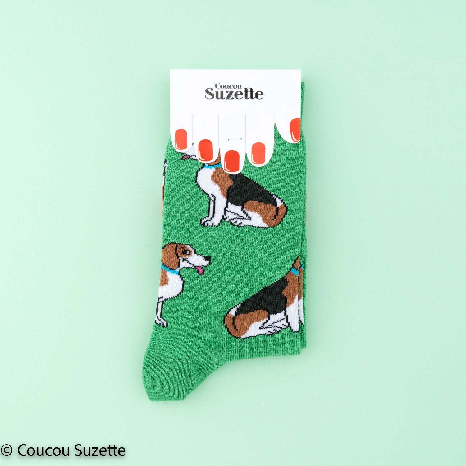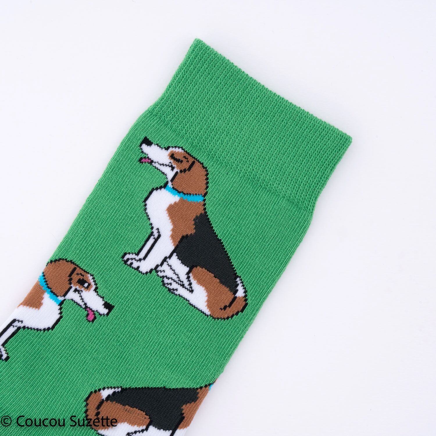 Flashy green cotton socks with a Beagle pattern, this pretty tricolor dog too cute with hanging ears. The ideal accessory to attract the attention of your crush at the dog park: you sit on an incognito bench, discreetly roll up your jeans, and stretch your legs while the dog runs after the pigeons... And hop, impossible not to catch your gaze!