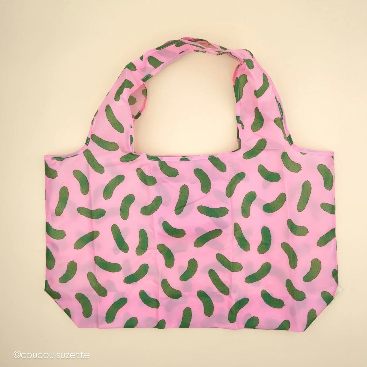 クーク・シュゼット・ショッピング・トート! 超軽量で繰り返し使えるバッグは、折りたためばファニーパックにぴったり。 リサイクル素材から作られた丈夫な生地は、宝物を持ち運ぶのに十分で、ピクニックやビーチの日にぴったり。 ピクニックやビーチにも最適です。もちろん、ピクルスのプリントがアクセントになっています!