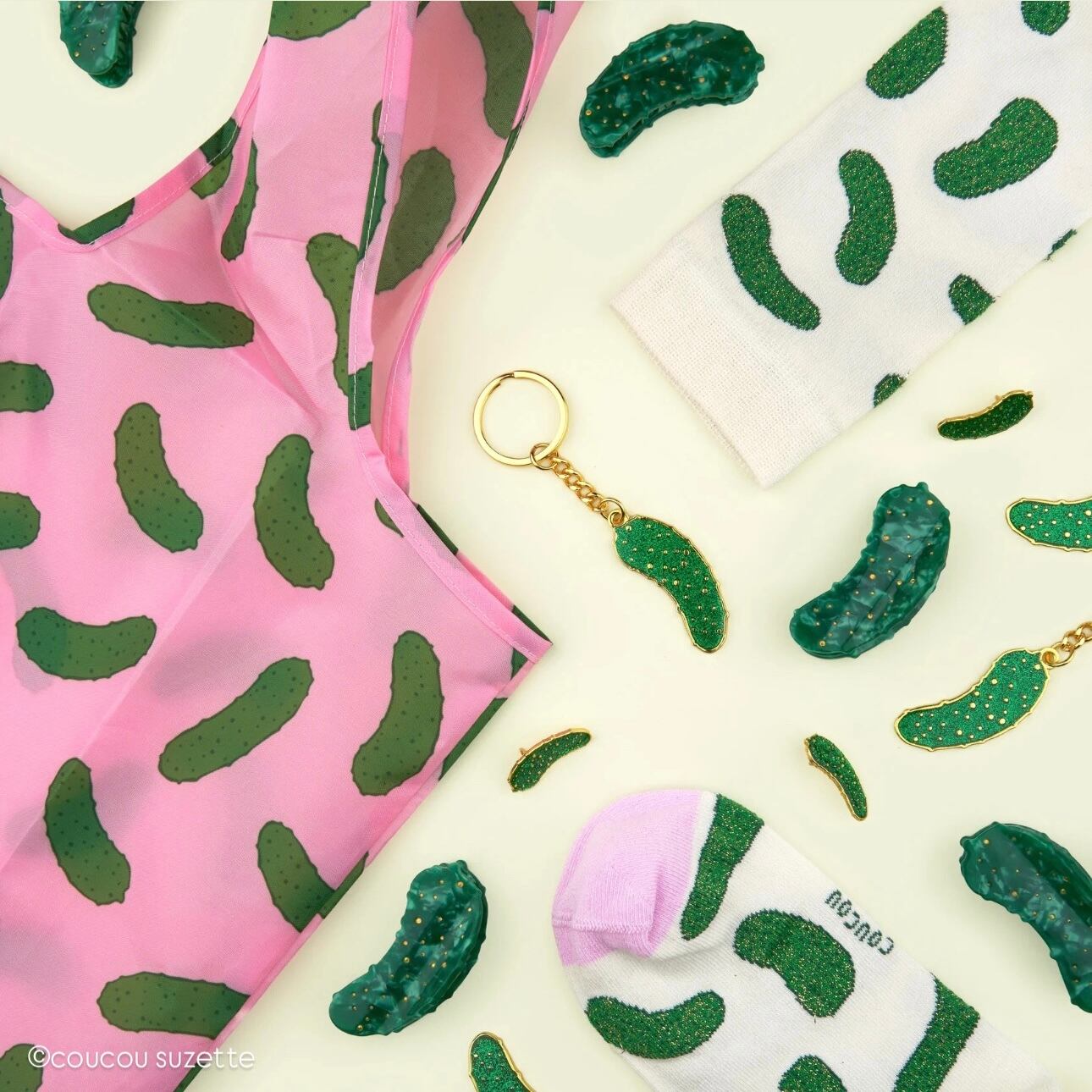 When life feels a little bland, it’s time to slip on our pickle socks! Tiny tangy cucumbers (yep, pickles are baby cucumbers!) dancing across a creamy background with soft pink details. What more could you want? Oh right—glitter, of course!