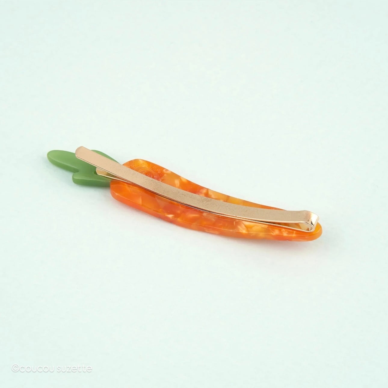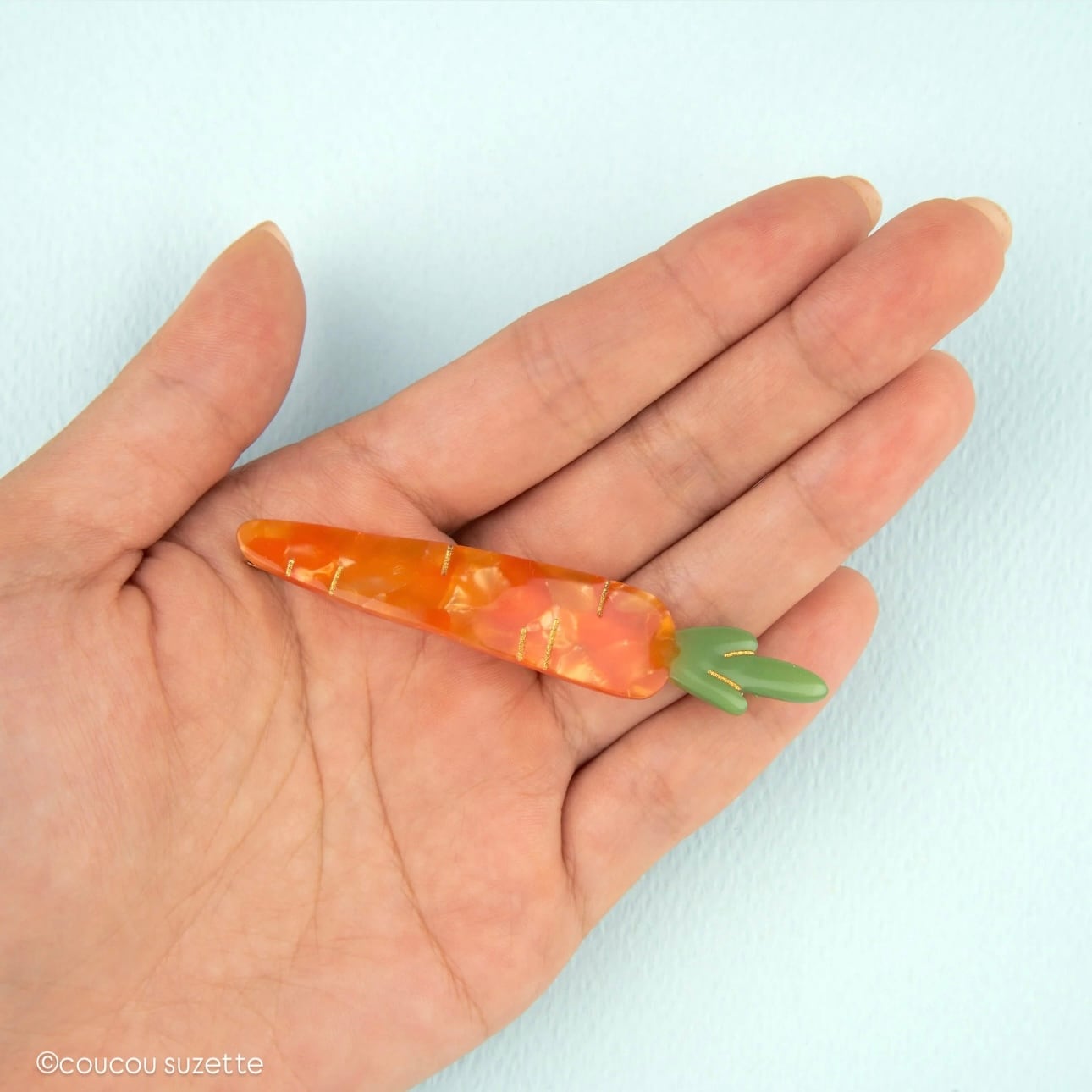 鮮やかな色使いと遊び心なら、ニンジンのヘアバレッタ! どんな髪質にもしっくりとなじむ、風変わりなアクセサリーに夢中。 アスパラガスのヘアクリップと合わせれば、シャキシャキ感がたまらない!