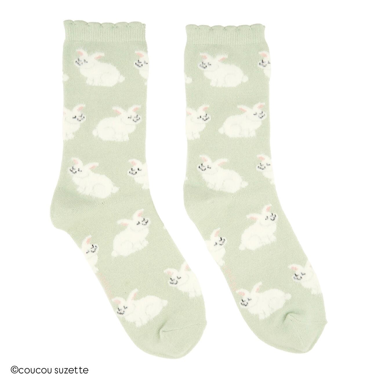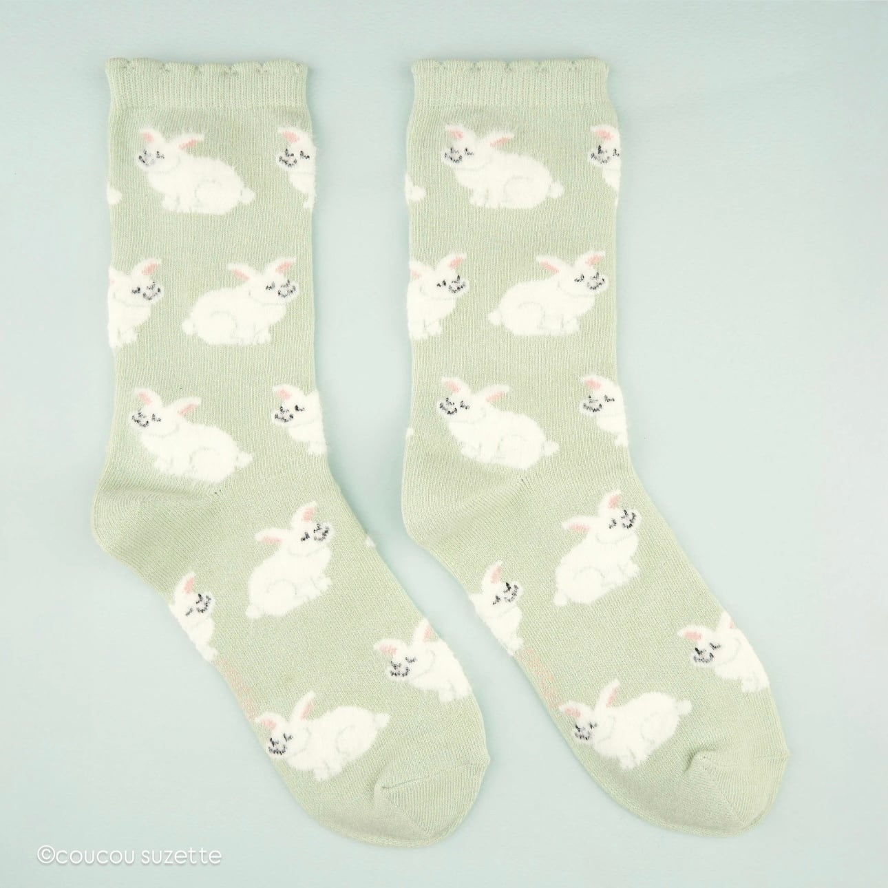 When life feels a little rough, it's time to add soft, fluffy socks to the mix! These original socks feature snow-white bunnies with ultra-realistic fuzzy fur, set against a lovely sage green background. We love the delicate ruffled trim at the ankles—it’s enough to make you want to hop straight into the woods for a little frolic.