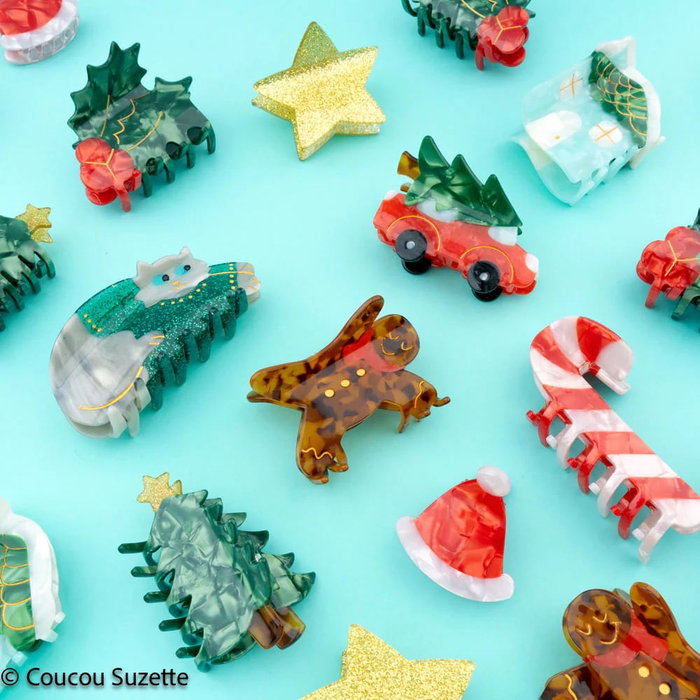 オーブンから焼きたてのホットジンジャーマンなしに、ホリデーシーズンが成り立つでしょうか?シナモンの甘い香りに酔いしれそうなこのクリスマスクッキーを、おそろいのヘアクリップで祝います。亀甲模様のスタイルに、美しい赤いマフラーと金色のディテールが施され、一口かじりたくなるようなデザインです。冬中、お祭り気分で居心地の良いヘアスタイルをトップに!