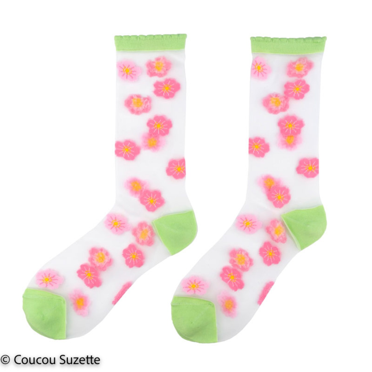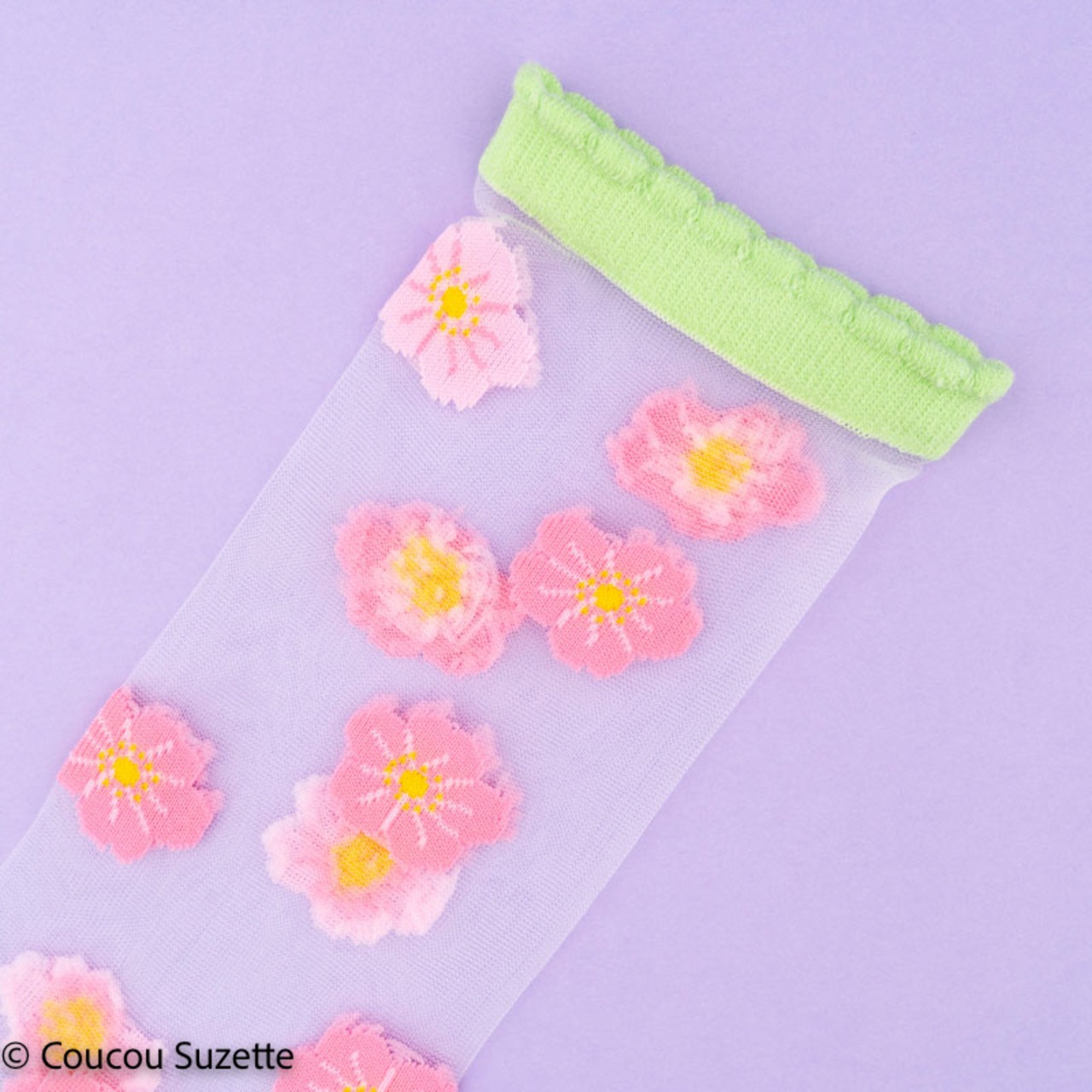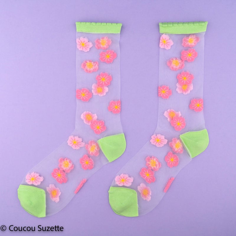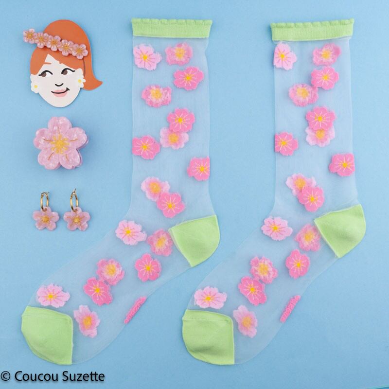 Transparent socks with Sakura patterns, this little pink beauty that covers the cherry trees in spring. This is enough to decorate your ankles with dignity, between the pimpante flower and the pretty anise green frown on the edge of the sock. A real small garden at our feet!