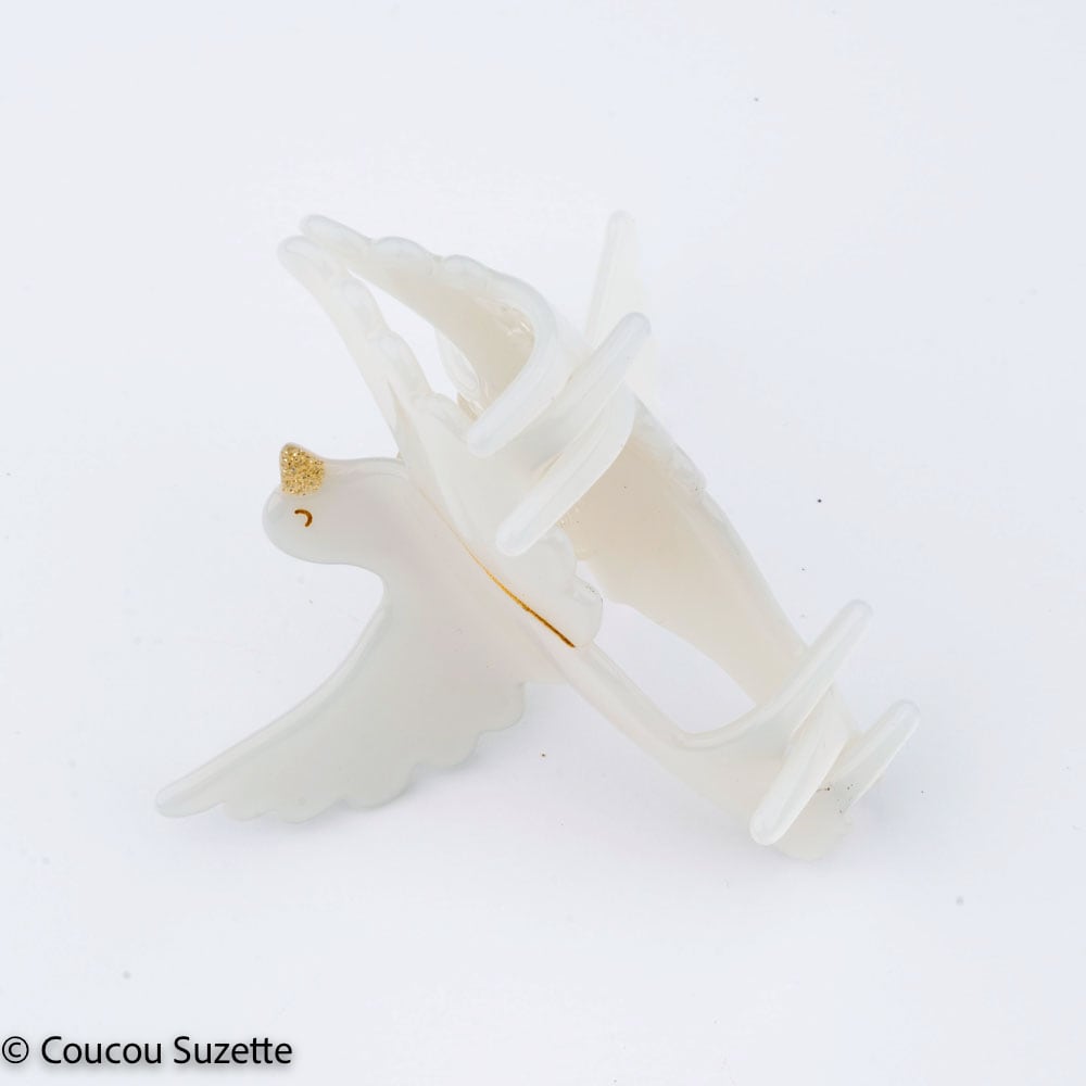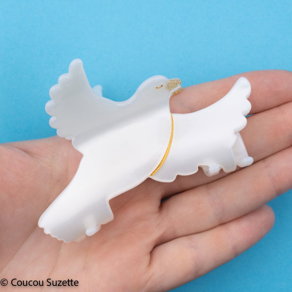 An immaculate hair claw, just like this beautiful dove taking off. We love the cute golden glitter beak and the eyes closed giving this bird a peaceful vibe. May this accessory bring you peace and super cool outfits.