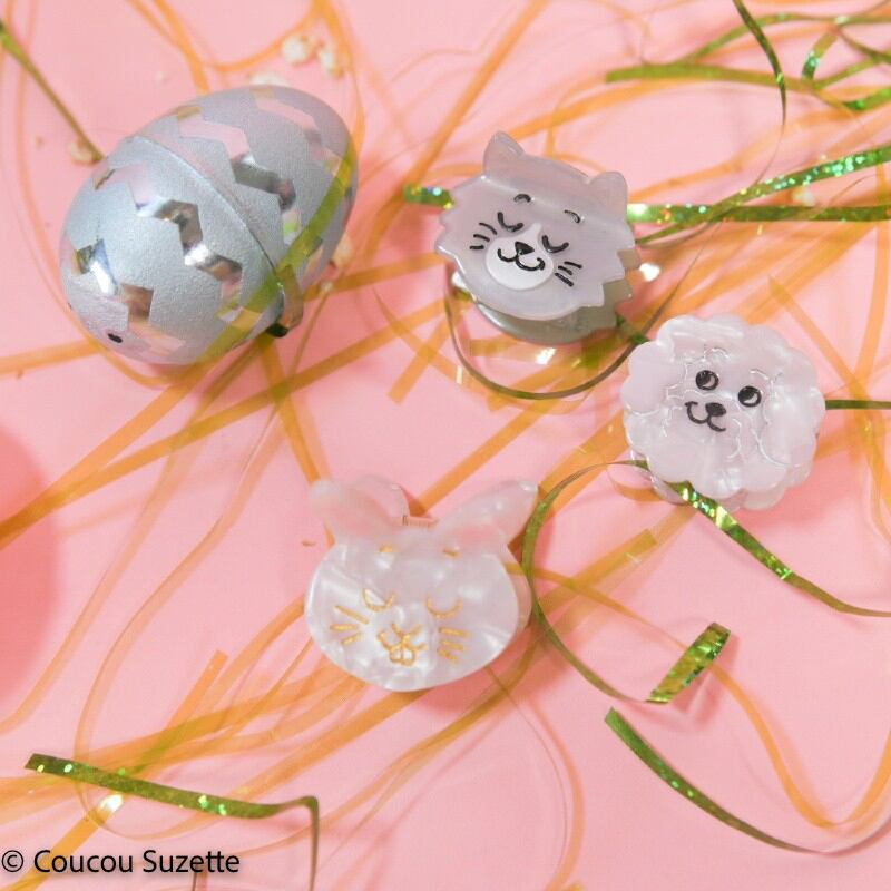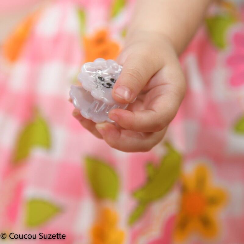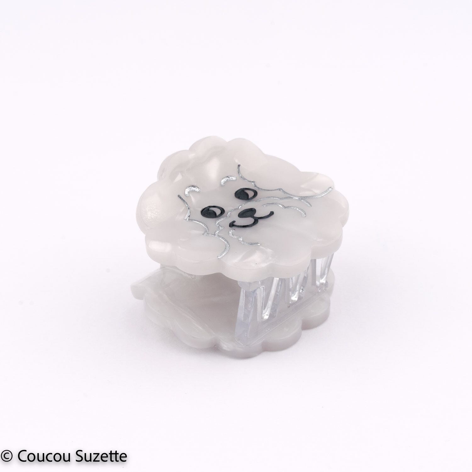 A mini hair claw shaped as a Bichon, with a cute smile and day-dreaming eyes. We love the acetate matter and its pearly look, as well as the adorable cloud shape.