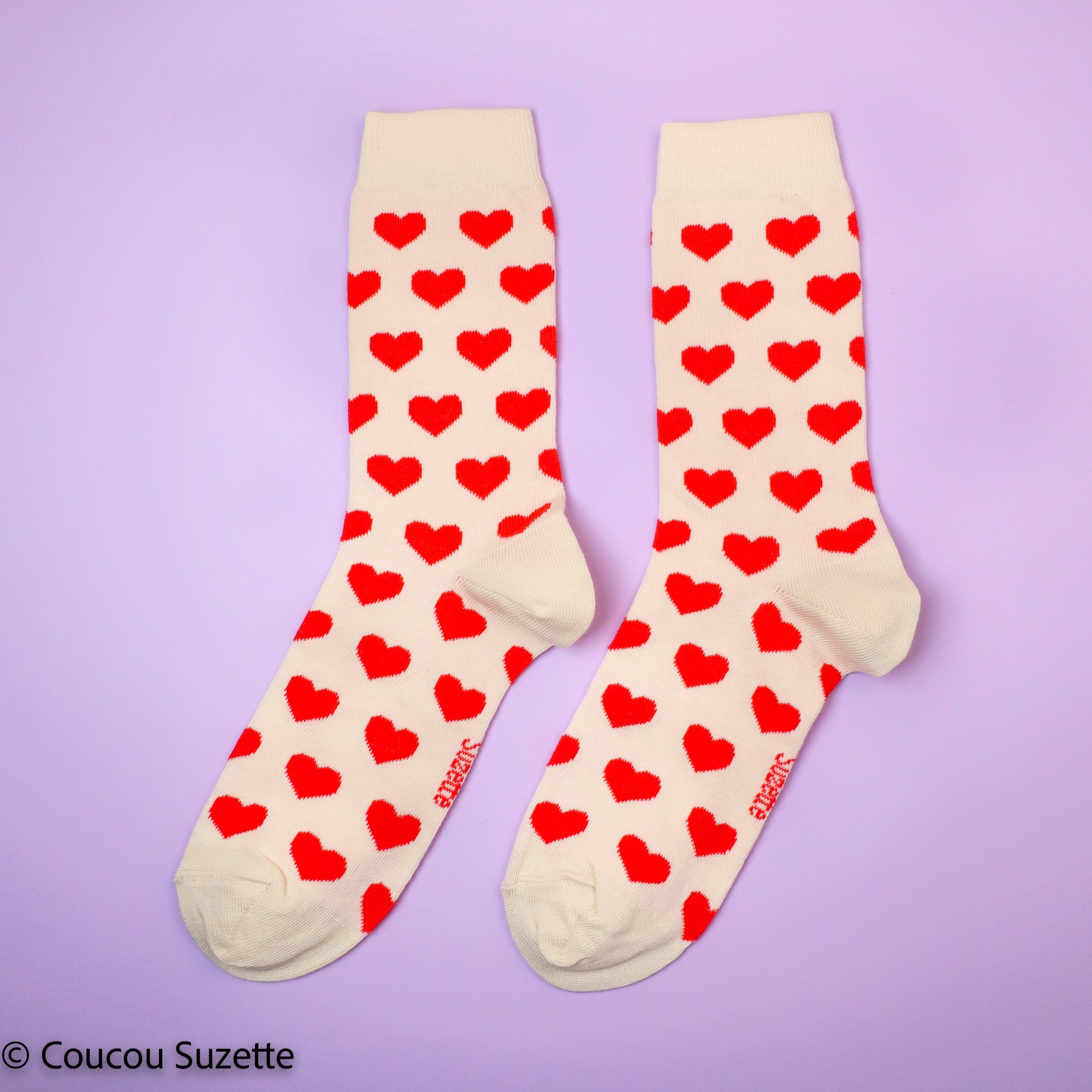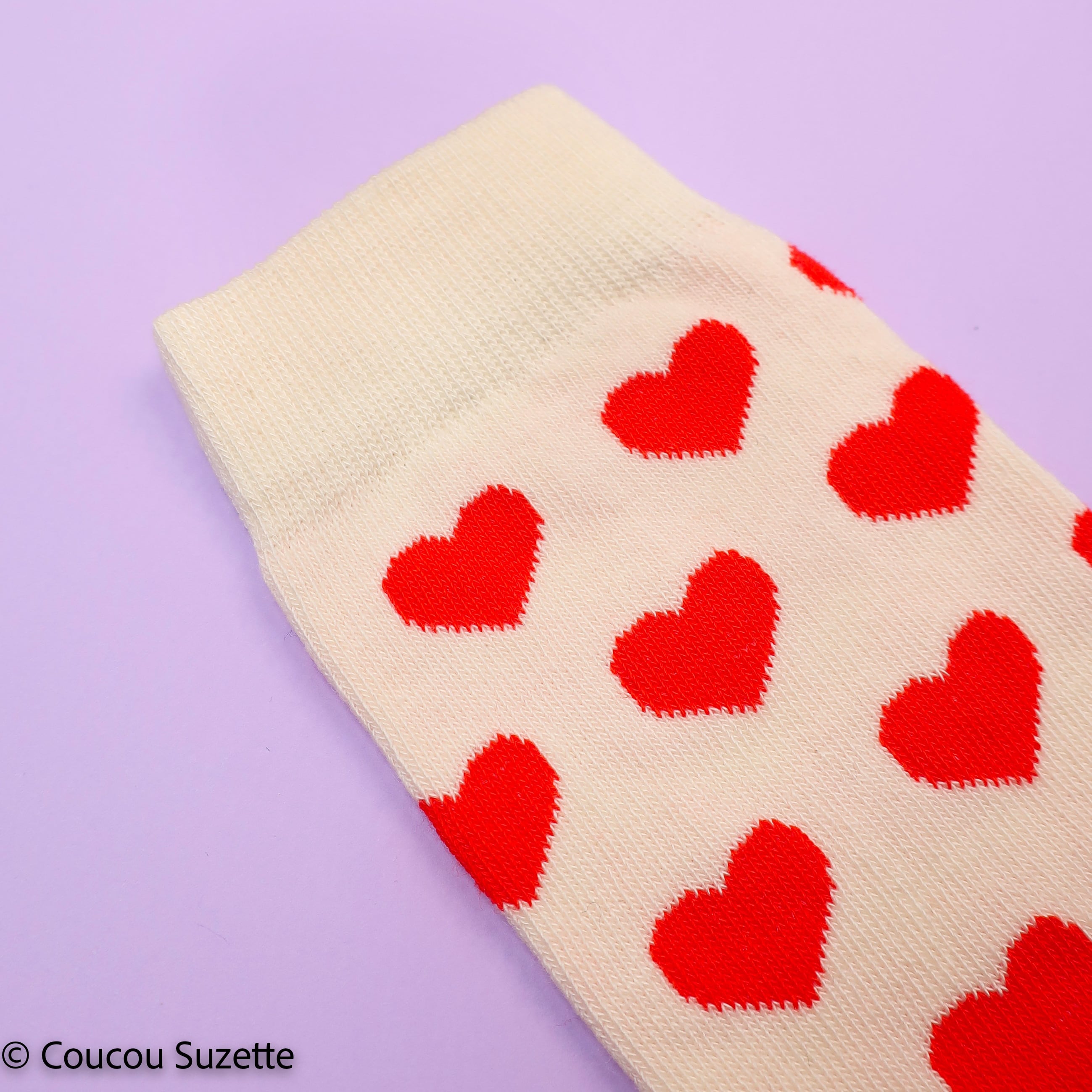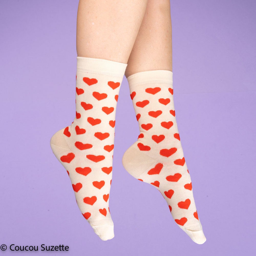 Cute romantic creme socks with a lovely red heart pattern! The perfect gift to show your love.