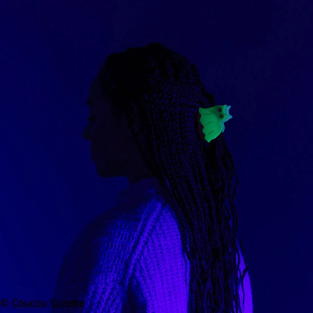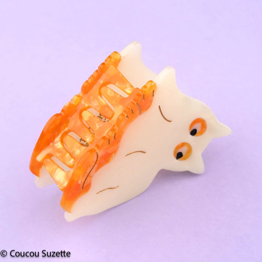 At Coucou Suzette we love to play with colors and materials... We are delighted to present you our very first phosphorescent accessory! A hair clip in the shape of an adorable ghost cat: by day, his disguise is white, but once the lights are off he shines in the night! A funny and original creation that will make a sensation on Halloween night.