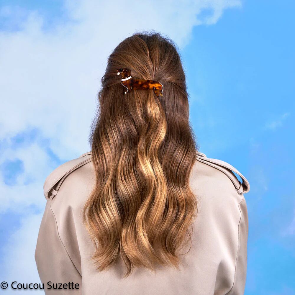 Our love dachshund in 90's barrette version! This accessory is a real Proust madeleine, often adopted at the time by our mothers. Here it is brought up to date with our favorite miniature dog. The perfect barrette for half a tail and other original hairstyles.