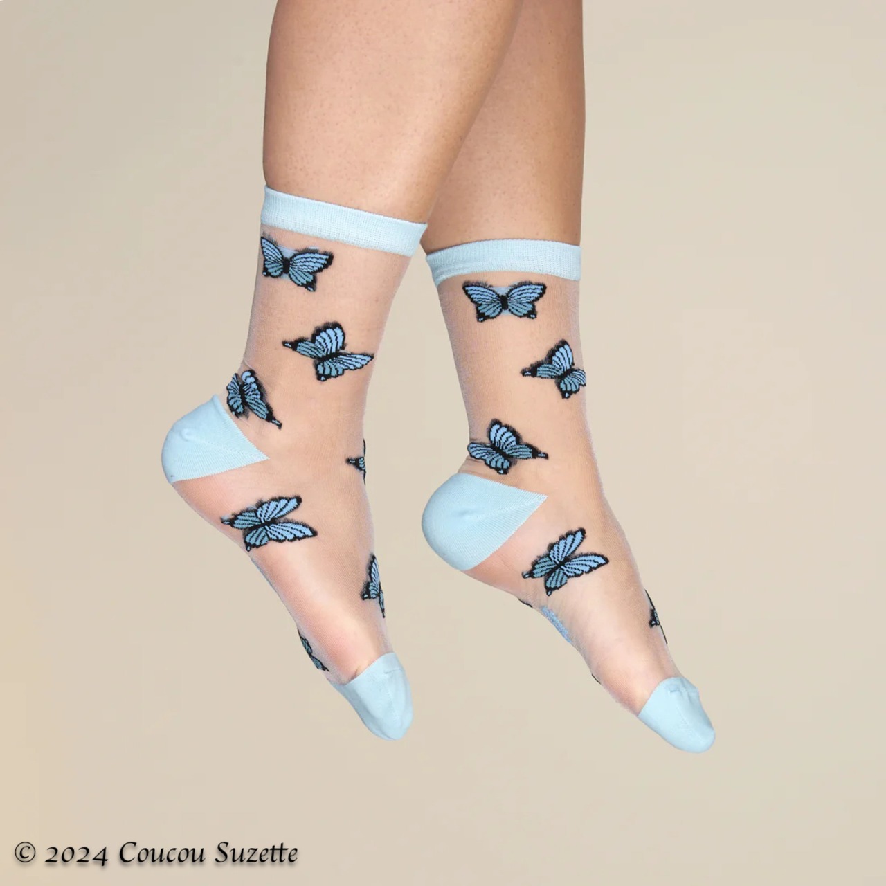 Transparent socks with beautiful blue butterflies. Put on this original accessory to celebrate sunny days and feel like a fairy for a day!