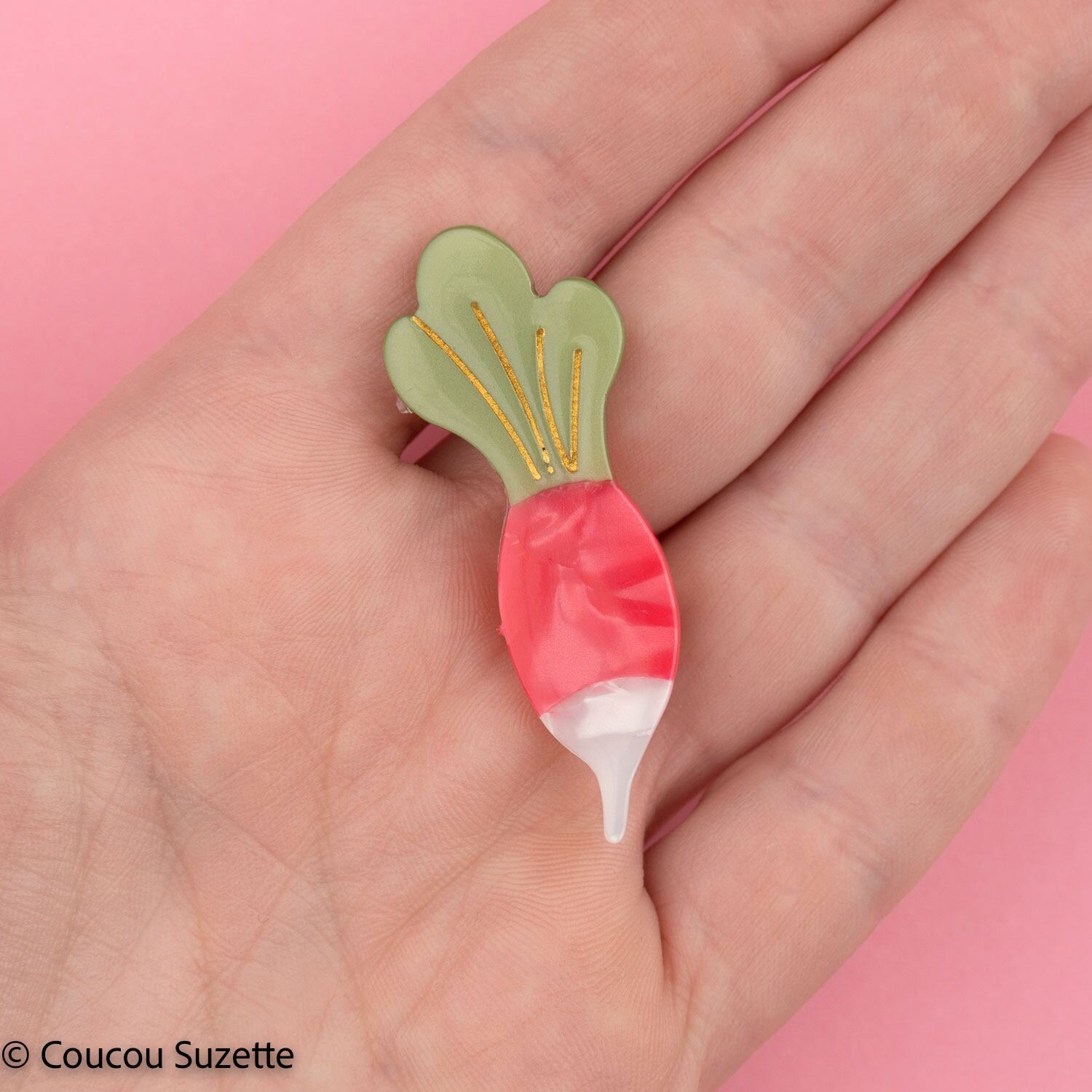 A super creative hair clip shaped as a cute radish we wish we could bite into! A tiny pink and white veggie, so cute with its green leaves covered in engraved gold ink details. And last but not least, the material is a nice iridescent cellulose acetate that gives endless shades and highlights to this little jewel accessory.
