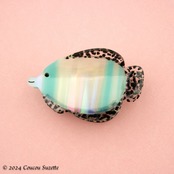 Oh, what a beautiful tropical fish! With its black-speckled fins, wry smile and pretty iridescent color reminding us of the rainbow fish of our childhood. A colorful hair claw who can’t wait to join a crossword puzzle by the water.
